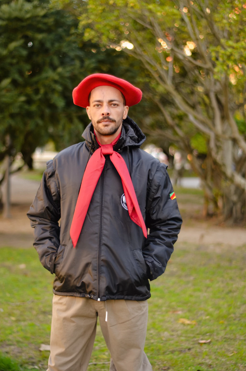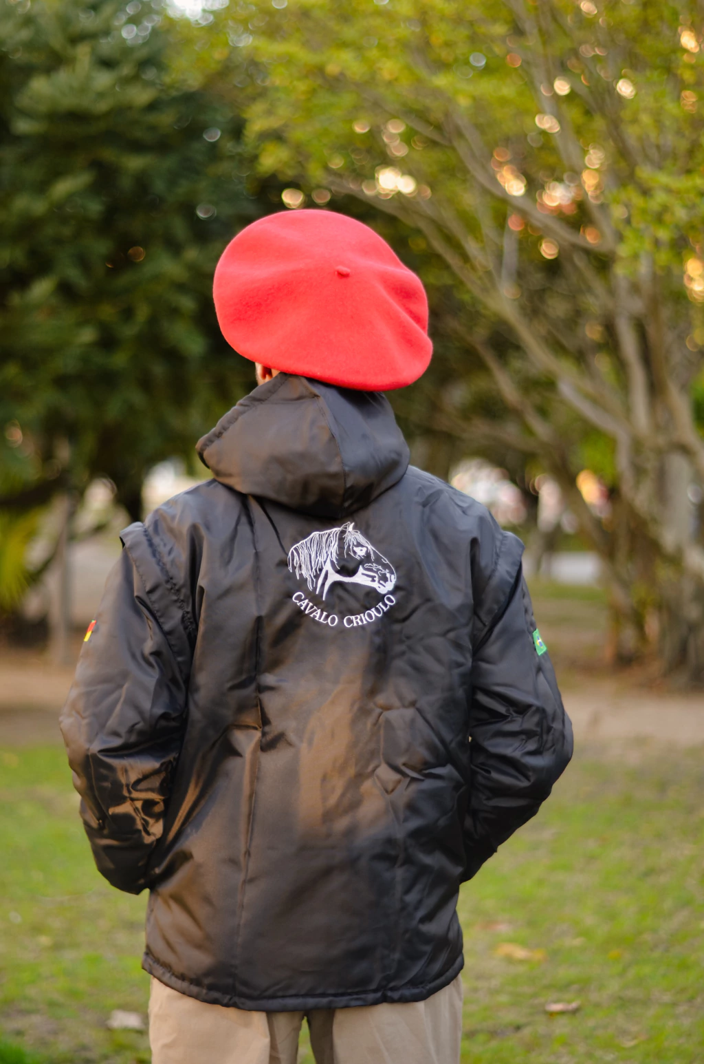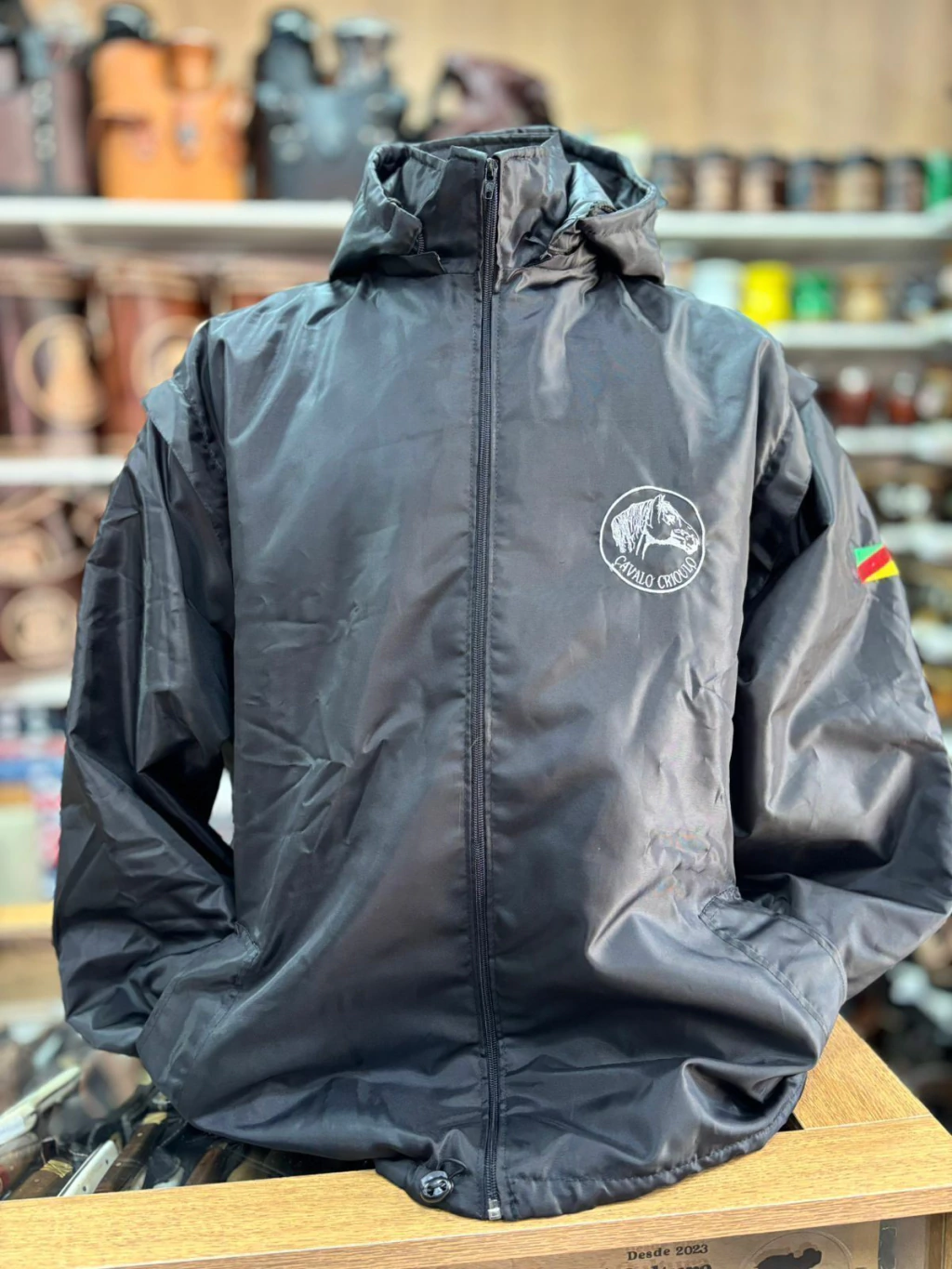 Feita em nylon impermeável, com mangas removíveis para uso como colete, bordado exclusivo Cavalo Crioulo e capuz removível.